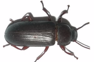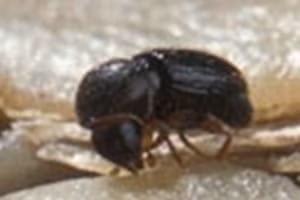 The borers are a type of beetle. The lesser grain borer is a “primary pest,” which alludes to the damage they cause to stored whole grains and other foods (secondary pests go after the damaged grain the primary pests fed on). Lesser grain borer beetles are dark brown or black with small pits on the wing covers. The borer will reduce grain to a mere shell. The most common infestation is of whole seeds such as corn or wheat. Control includes elimination of the infested source, freezing or cooking the food or, if the case is extreme, fumigation may be used. The borer when dead has an odor, which leaves food that was infested to be contaminated.