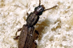 There are quite a few different species of beetles but most common are the sawtoothed grain beetle, the flour beetle, the drugstore beetle and the cigarette beetle with the flour beetle being the most common beetle. These beetles are most easily taken care of by getting rid of the infested material. Pesticide use is limited considering that food is being dealt with. Freezing, heating or disposal of the infested food can eliminate the pest.
